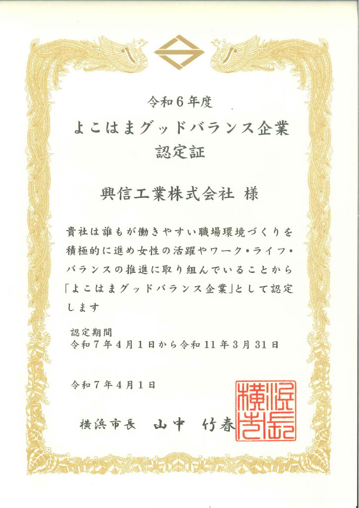 令和6年度 よこはまグッドバランス企業 認定証 令和7年4月1日
