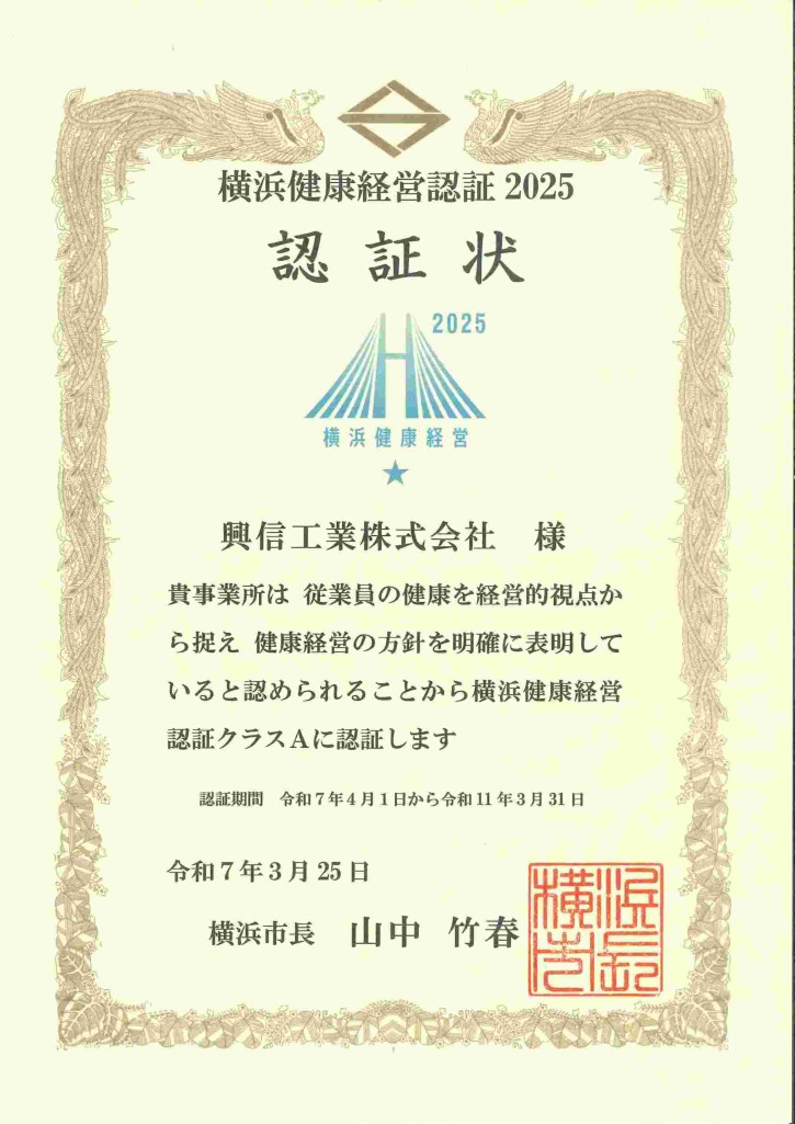 横浜健康経営認証2025 認証状 令和7年3月25日