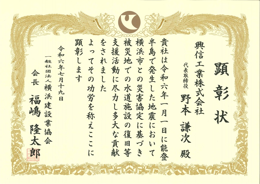 顕彰状 一般社団法人横浜建設業協会より顕彰状をいただきました