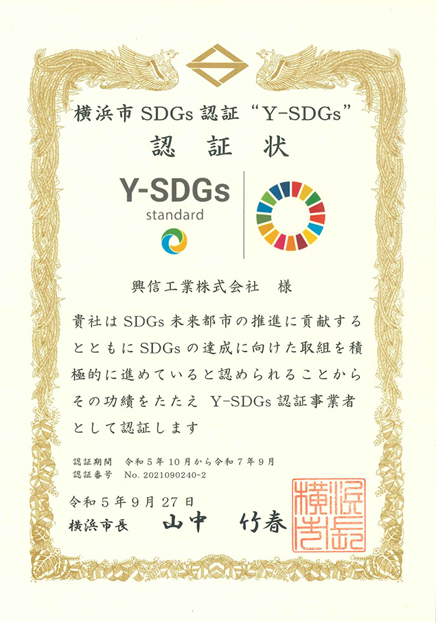 横浜市SDGs認証”Y-SDGs” 認証状 令和5年9月27日