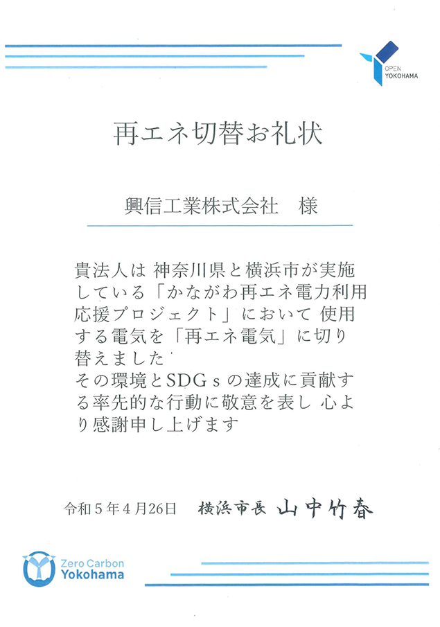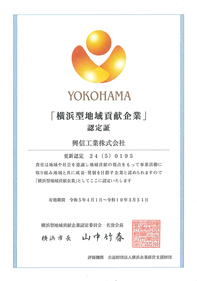 横浜型地域貢献企業 認定証 令和5年4月1日~令和10年3月31日